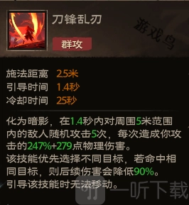 效果:遁入暗影,在1.4秒的时间里,对自身周围半径5米范围内的敌人发动5次随机攻击,每次攻击造成相当于你攻击力247%加上279点的物理伤害。