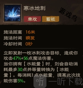 效果:即刻发射一枚冰刺对目标展开攻击,造成相当于你攻击力47%加上56点的魔法伤害。若你持有【水能量】,便会自动消耗至多30点【水能量】,并将其等量转化为【冰能量】。每消耗1点【水能量】,此次技能伤害提升5% 。