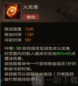效果:吟唱1.5秒后在指定区域生成火龙卷对范围内的敌人造成你攻击80%+93点魔法伤害。