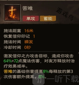 效果:激发信仰之力攻击目标,造成你攻击64%+72点魔法伤害,队友方释放时治疗效果减半。