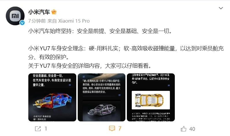 与此同时,小米汽车官方微博也发声称:“小米汽车一直秉持着这样的理念:安全是前提,安全是基础,安全更是一切的根本。”