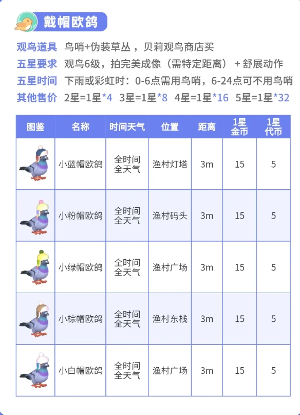 拍摄五星照片的条件是观鸟等级需达到6级-2,同时要备齐自动鸟哨-2、伪装草丛-2这类辅助工具。当处于雨天或者彩虹天的0到6点这个时段时,一定要借助鸟哨来吸引欧鸽现身-2。