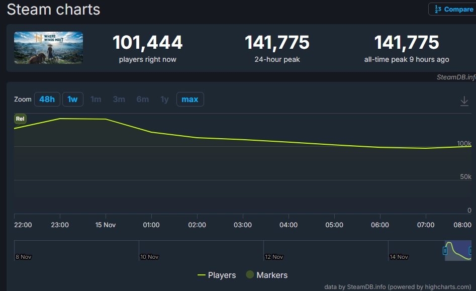 网易旗下开放世界动作RPG名作《燕云十六声》的日版《风燕传:Where Winds Meet》近期已在PC/PS5平台正式发售,游戏本体免费,上线后迅速吸引大量关注;据最新数据,其Steam平台同时在线玩家峰值已突破14万。