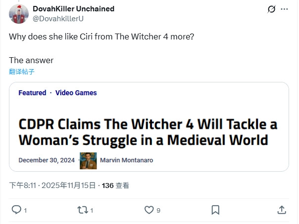 玩家觉得她更偏爱《巫师4》里的希里,是因为CDPR之前提过,《巫师4》会去挖掘一位女性在中世纪背景下艰难生存的境遇。