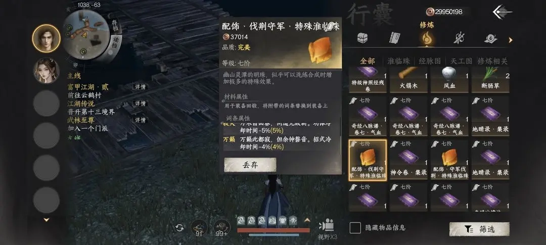 在前往一气屿提交最终阶段任务之前,建议手动保存一下游戏进度。提交任务后得到的饰品临淮珠,其属性是随机生成的,要是通过反复读取存档的方式,能够刷出带有三寂灭这类极品词条的临淮珠,而其中减少15%技能冷却时间的属性,对战斗的助力十分明显。