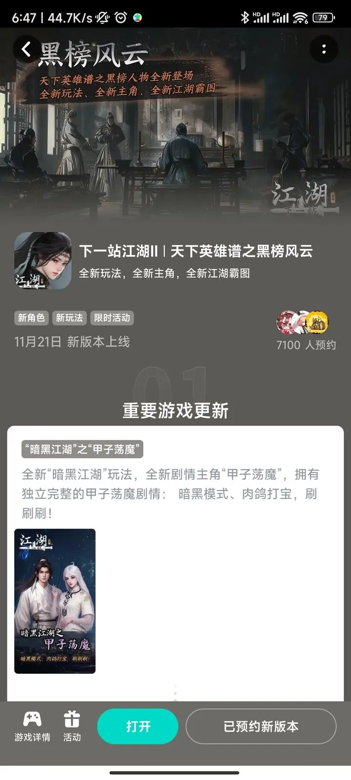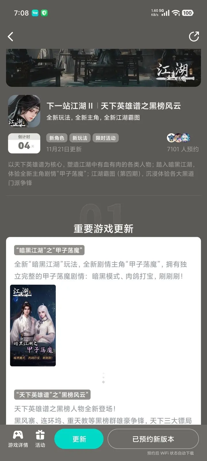 下一站江湖2将在11月21日开启天下英雄谱之黑榜风云的大型版本更新,这次更新会带来全新主角、暗黑江湖玩法以及第四期江湖霸图。玩家能通过参与预约活动免费得到武器特效和外观礼包,体验肉鸽打宝、黑道门派等多项新增内容,开启不一样的暗黑武侠之旅。