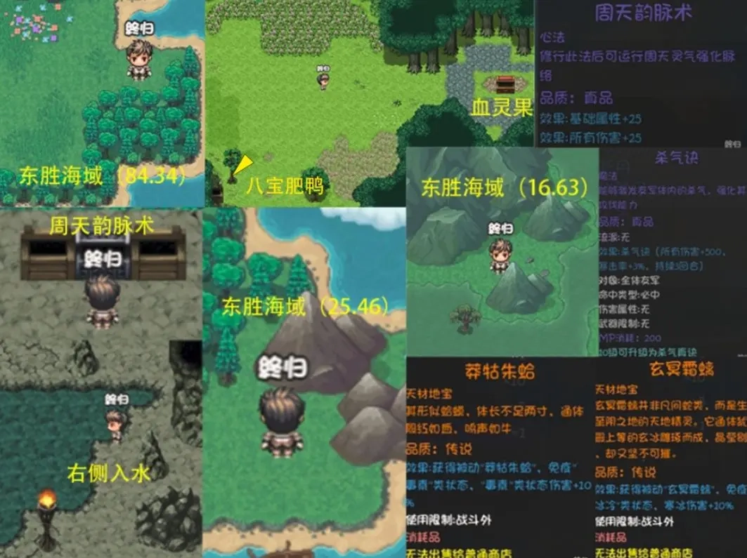 在东胜海域的84.34坐标点,能够采集到血灵果和八宝肥鸭——血灵果是角色培养的所需之物,八宝肥鸭则是美食珍馐任务的道具。25.46坐标位置藏着周天韵脉术心法与悟道古茶,这两样物品对提升角色属性有着明显的效果。隐藏洞穴坐落在16.63坐标处,洞穴一层的四个宝箱里装有月辉石、铁皮炸弹等进阶材料,而在二层雕像的右侧,能获得杀气决技能书。