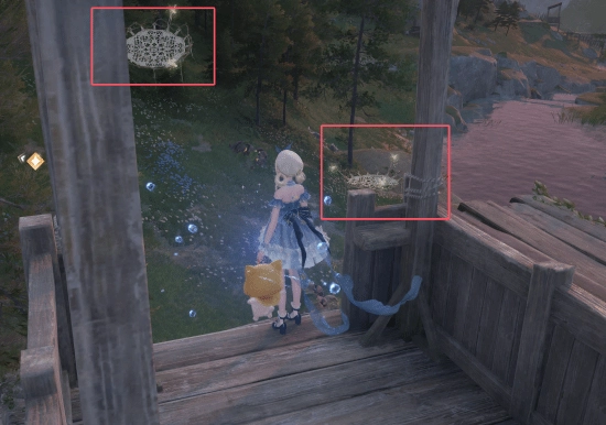 2. 当玩家抵达指定位置时,便能瞧见一座小型木质哨塔。借助图中所标记的两个蹦床,玩家就能够跳上哨塔。
