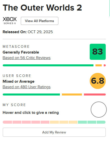 《天外世界2》于今年10月30日正式发售,其简体中文版本的玩家评价呈现出褒贬不一的态势,在597篇用户评价里,仅有63%的评价为好评。而在Metacritic平台上,这款游戏的用户评分也大致相近,为6.8分。
