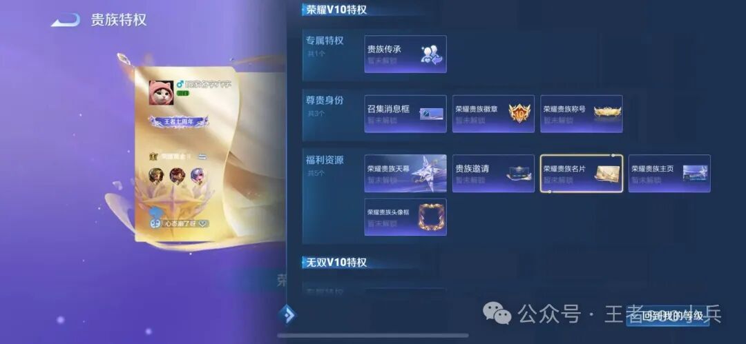 当然了,除了对局内希望新增的功能外,对局外玩家们也期待能加入一些新内容。比如面向氪金玩家的专属功能:荣耀V10等级的贵族用户,可获得一次自选无双限定道具的机会。值得一提的是,在王者荣耀的贵族体系里,除了V8和普通V10外,无双V10与荣耀V10这两个更高等级的玩家,目前都还没有专属的定制皮肤。