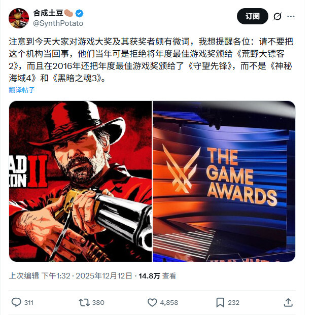 评论区里有不少玩家都为《荒野大镖客2》惋惜,毕竟它在2018年的TGA颁奖典礼上输给了《战神4》。