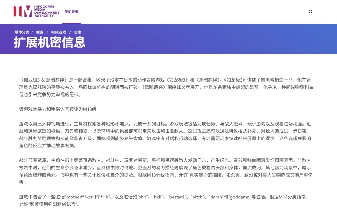 新加坡资讯通信媒体发展局(IMDA)已为《如龙极3》与《如龙3外传 Dark Ties》评定M18分级,并附上详细说明,阐述了这两款游戏合集所包含的暴力程度、粗俗语言以及成人向主题。此分级适用于名为《如龙极3 & Dark Ties》的合辑版本,该版本将两款以日本为故事舞台、围绕彼此关联的犯罪叙事展开的冒险游戏整合在了一起。