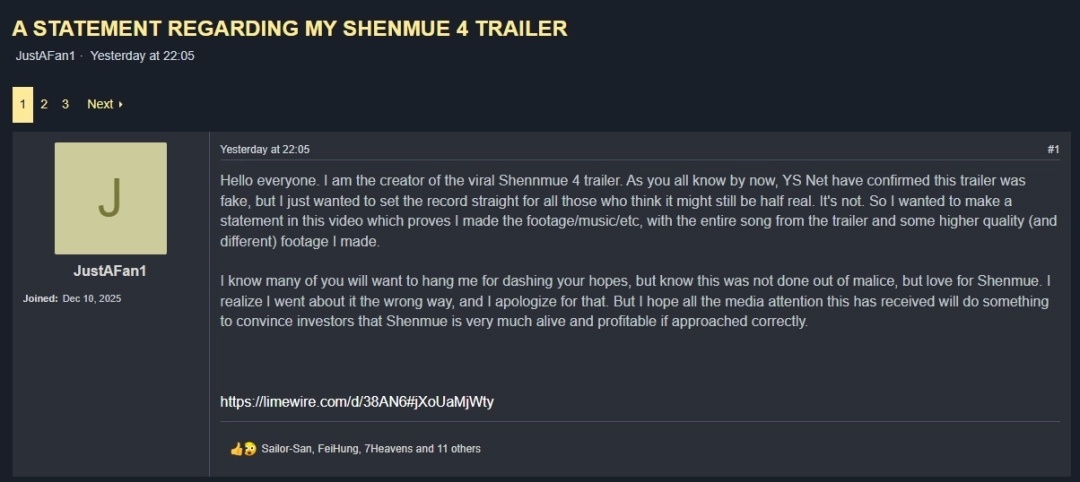 12月11日,自称是伪造预告片制作者的“JustAFan1”在用户社区“莎木道场”上发表声明,解释了相关视频内容,并发布了道歉视频。
