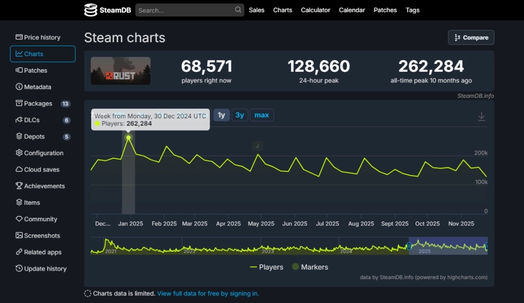 更令人惊叹的是,即便在发布十余年后,《Rust》在Steam平台上的同时在线玩家峰值仍能长期保持在15万左右,甚至在今年初曾创下超过26万的同时在线新纪录。充分证明了其核心玩法所拥有的持久魅力与社区活力。