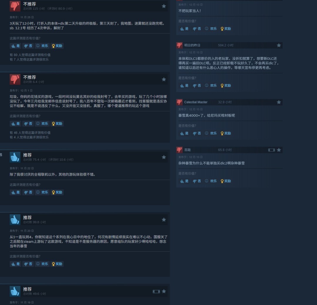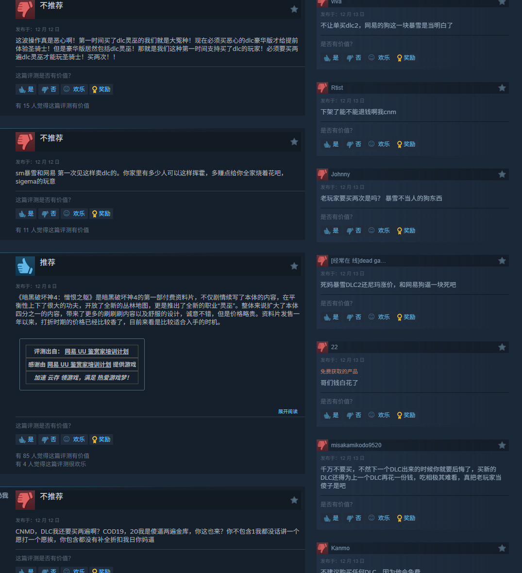 作为本体和DLC1都是原价入手的老玩家,没折扣也就算了,现在想玩新DLC居然还要重新买一遍旧DLC?反正游戏早就卸载不玩了,这次肯定不会再买新DLC了,谁知道以后还会有什么让人不舒服的操作,还是等哪天官方宣布停止更新了再说吧。