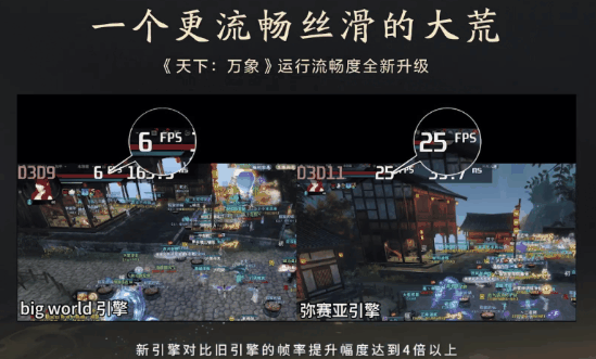 拿一个简单的例子来说,有了新引擎的助力,《天下:万象》的制作团队得以对游戏里的场景展开一次“精雕细琢”的翻新工作。大家以前见到的“纸片树”,如今会以更为逼真、立体的样子展现出来;而之前存在卡顿问题的场景,也能变得更加流畅。笔者在现场实际测试后发现,在多人同屏的场景中,游戏帧率确实有了2到4倍的提升,运行速度也比之前快了很多。