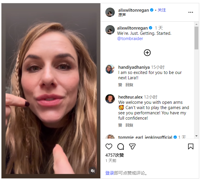之后Alix Wilton Regan发文表示:“被正式宣布成为新一代劳拉·克劳馥的扮演者,这无疑是我职业生涯里的高光时刻,甚至超出了我最天马行空的想象。”