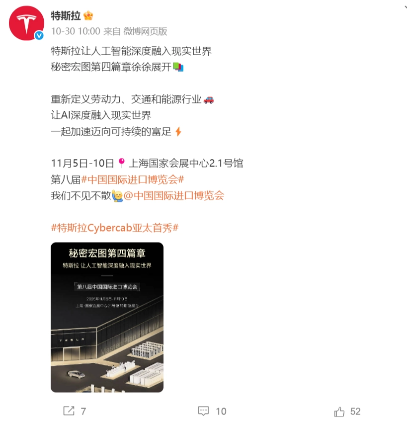 特别需要说明的是,特斯拉官方微博发布消息称,其旗下的Cybercab无人驾驶出租车,将在11月5日开幕的上海进博会上完成亚太地区的首次公开亮相。