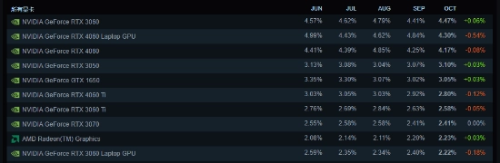 10月的Steam硬件调查结果现已正式发布,GeForce RTX 3060显卡重新登上“最受欢迎独立游戏显卡”的榜首,RTX 4060则位列第二。在PC玩家使用的“独立游戏显卡TOP30”榜单里,英伟达依旧占据主导地位。该品牌增长速度最快的RTX Blackwell系列显卡是RTX 5070,排在它后面的是主流型号RTX 5060。