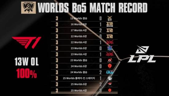 截至目前,T1在世界赛BO5的赛场上对LPL赛区依旧保持着令人畏惧的统治力,不仅创下了13连胜的傲人纪录,而且至今还未遭遇过一场失利。