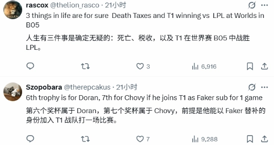 在评论区里,许多海外玩家热烈讨论着TES此次的惨败,还有玩家玩起了梗,说道:“人生有三件无法避免的事:死亡、税收,以及T1在世界赛BO5里击败LPL队伍。”