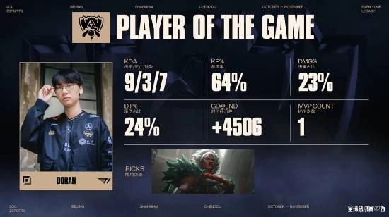 3比赛进行到35分钟时,中路区域爆发激烈团战。Doran操控的安蓓萨释放大招精准命中艾希,并且成功斩获双杀。最终T1将KT全员击溃完成团灭,随后顺势一路推进摧毁对方基地,成功锁定这场比赛的胜利。
