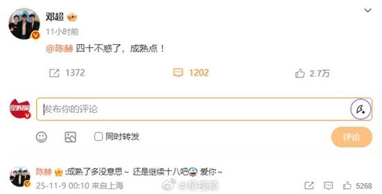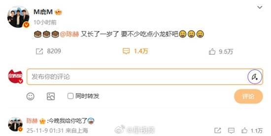 评论区里有人留言说:“数了半天呢。”陈赫随即回应道:“来,让我给你一个拥抱~” 与此同时,邓超、鹿晗和范志毅也纷纷发文为陈赫送上生日祝福,调侃道:“该成熟一点啦,还有小龙虾可别吃太多!”