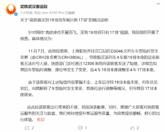 11月7日,由我段担当值乘任务、从上海虹桥站开往汉口站的D3046次列车,因车型临时调整(由CRH2B型更换为CRH380AL型),致使购买该趟列车4号车厢19排B座车票的旅客无法按照票面信息对号入座。