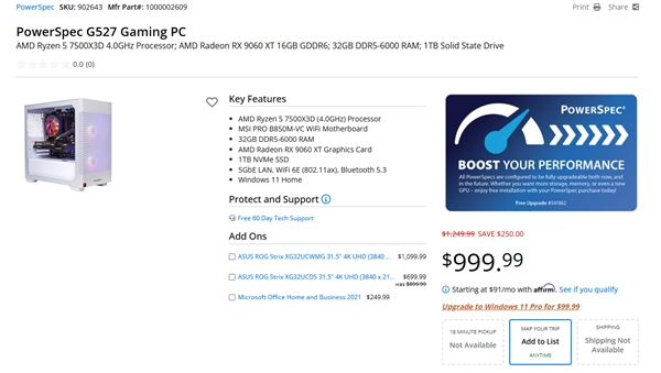 继两天前在Geekbench平台曝光后,这款产品如今已出现在Micro Center上架销售的PowerSpec G527游戏PC配置清单中。