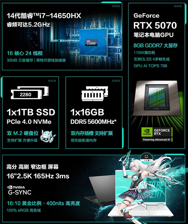 标配酷睿i7-14650HX处理器、RTX 5070 Laptop GPU显卡、16GB内存、1TB SSD、魔幻青配色,到手价8498元,晒单同样返30元E卡,以旧换新还可补贴最多1250元。