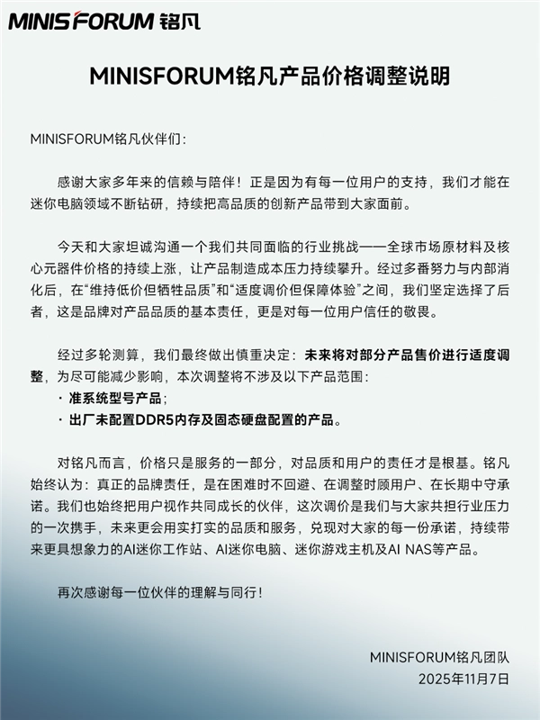 11月9日消息,此轮内存与硬盘价格上涨,对整个PC硬件生态几乎造成了影响,近日铭凡Minisforum官方已发布价格调整通知,表示会对旗下产品价格进行上调。