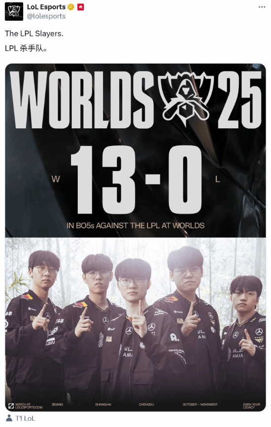 算起来,Faker在S赛BO5对阵LPL的战绩已经达到13胜0负,自S3赛季至今的13年间保持不败,就连《英雄联盟》官方推特都称他为“The LPL Slayers(LPL杀手)”。