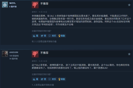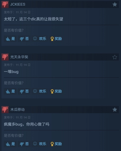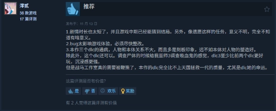 给出差评的玩家大多认为这款DLC制作得太过仓促,剧情上呈现出虎头蛇尾的问题,而且游戏流程也比较短,同时它的BUG问题也相当严重。