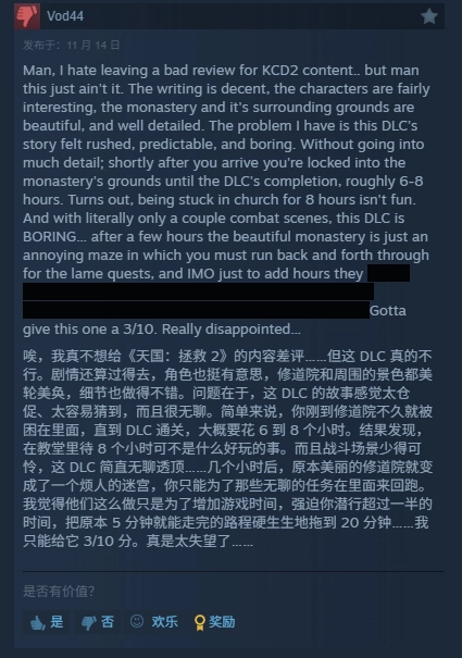 《天国拯救2》规划中的最后一个DLC《修道院瘟疫》已经推出,当前该DLC在Steam平台上的评价呈现褒贬不一的状态。