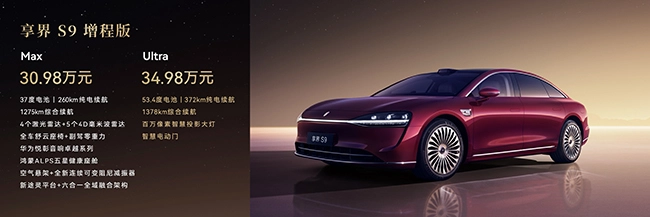 旗舰9系,越境豪华。新款享界S9共发布4个版本车型,具体价格如下:增程版Max售价30.98万元,增程版Ultra售价34.98万元,纯电版Max售价32.98万元,纯电版Ultra售价36.98万元。 在首销期间下单,用户可享至高60000元的权益,涵盖多项福利:寰宇红/浩宇蓝外饰限时免费(价值至高10000元)、零重力座椅抵扣券(价值10000元)、ADS高阶功能包补贴(价值20000元)、舒享用车大礼包(价值6000元)、辅助驾驶无忧服务权益(价值4000元),以及至高10000元的定向选配优惠。首销权益的有效期截止到2025年12月22日23:59:59,且预订权益支持叠加使用,同时还提供至高15000元的购置税补贴方案。 此外,鸿蒙智行其他车型的车主若增购或换购新款享界S9,可享受尾款减免20000元的优惠。目前,新款享界S9的试驾车已逐步进驻全国门店,用户可通过全国800余家线下体验阵地,或鸿蒙智行官网、鸿蒙智行App、华为商城App、我的华为App等官方线上渠道,预约试驾体验。