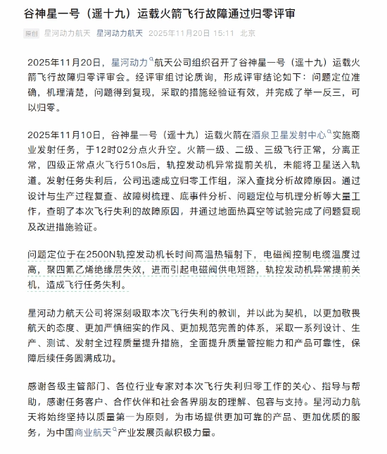 根据官方发布的公告,星河动力航天于今日组织召开了飞行故障归零评审会议,会议最终形成的评审结论为:问题定位精准无误,故障机理已完全明晰,相关问题也成功实现复现,所采取的应对措施经检验切实有效,且已完成举一反三工作,因此该故障可予以归零处理。