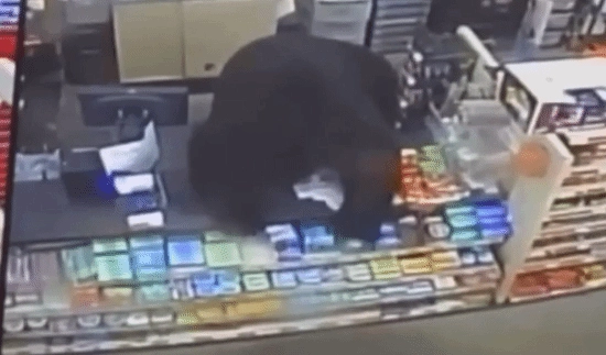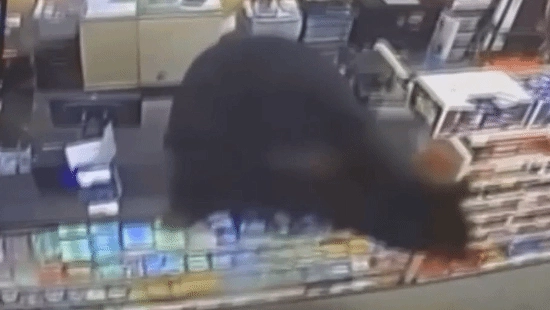 科尔跑到收银台向店员求助,两人在店里来回奔跑,黑熊居然跳上收银台,想要靠近男孩,这惊悚的一幕被店内监控完整记录了下来。