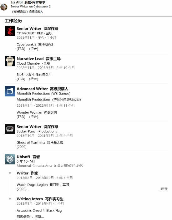 另外需要指出的是,尽管她在领英界面使用了“赛博朋克2”的名称,且CDPR官方也在使用这一表述,但官方此前明确表示这“仅仅是一个临时代号”,并非该游戏的正式名称。