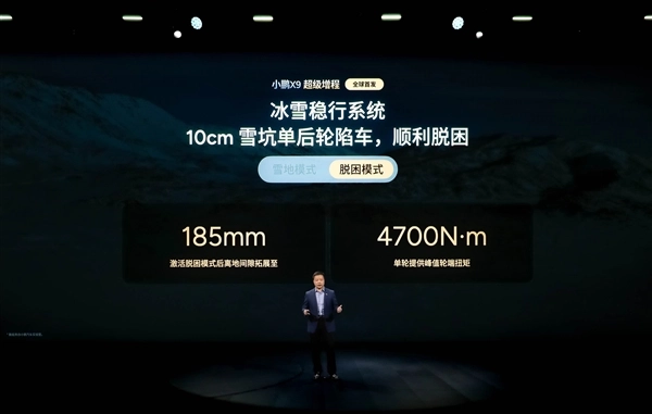 在脱困模式下,小鹏X9的超级增程系统能够输出高达4700N·m的单轮峰值扭矩,即便车辆陷入10厘米深的雪坑,也能轻松实现脱困。