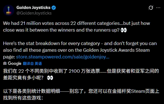 今日凌晨,金摇杆官方通过社交媒体发布消息称,今年在22个不同类别的奖项评选中,共收到了2100万张选票!