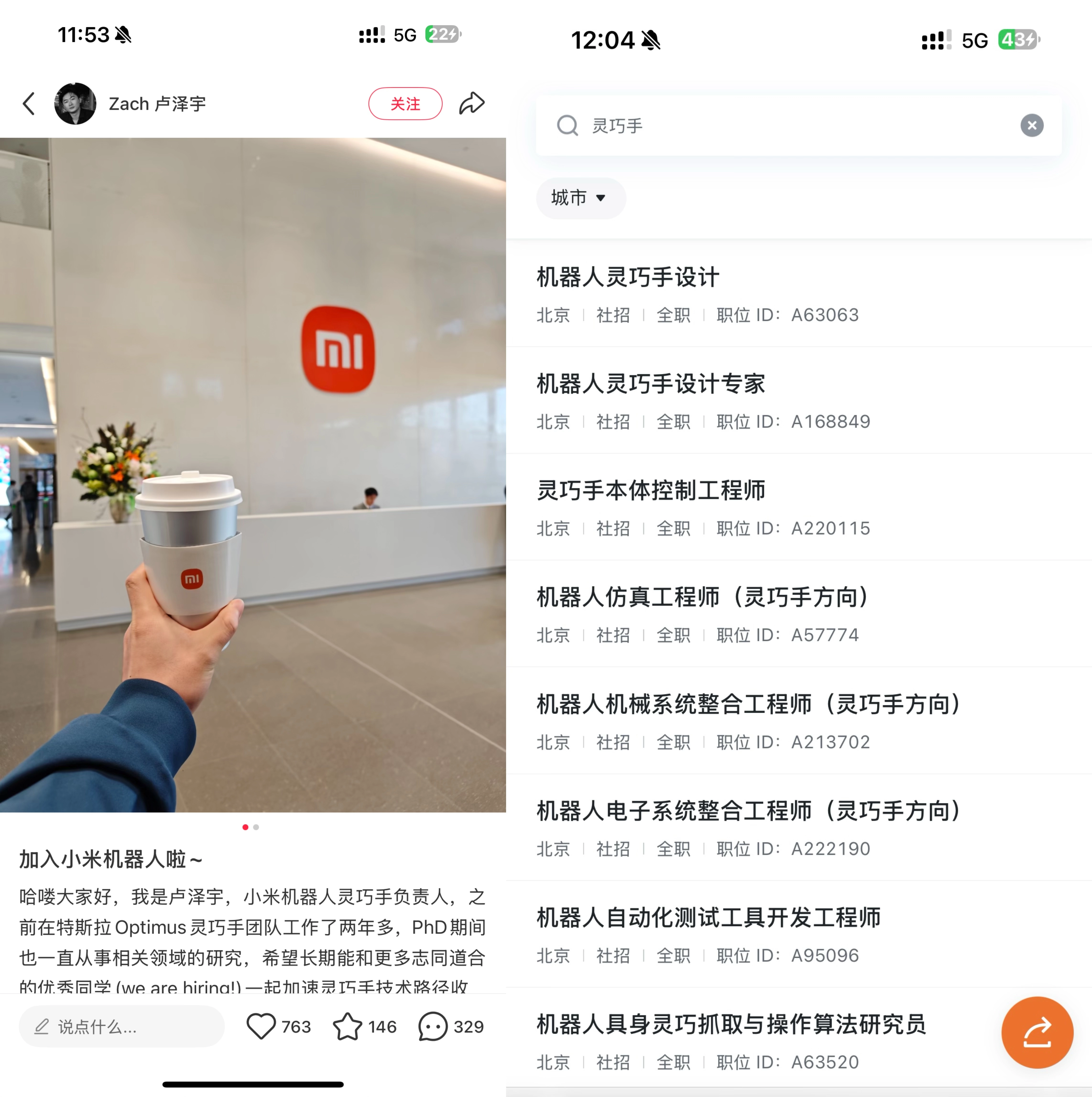 至于为何从特斯拉跳槽到小米?小雷推测无外乎两个原因:其一,小米赋予了他足够的话语权,能让他带队推进技术落地,将技术转化为可购买的产品;其二,小米目前在机器人领域确实投入重金。从招聘平台的数据来看,小米机器人相关岗位数量超过200个,仅灵巧手岗位就招聘12人,覆盖了从设计到算法的全流程。
