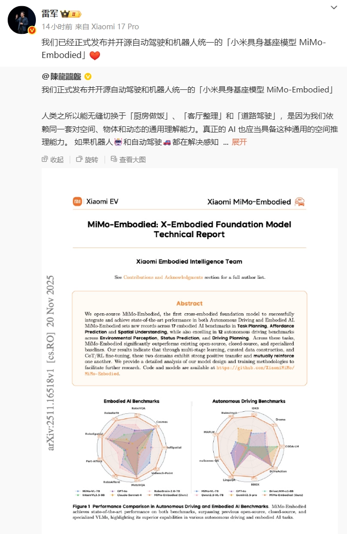 更值得关注的是,就在前几天,小米刚刚对外宣布,其自主研发的具身大模型 MiMo-Embodied 已正式发布,并且同步开启了全面开源。这款模型不仅能够助力机器人完成推理、规划、空间认知等核心任务,还可以为自动驾驶的感知、预测以及驾驶规划提供有力支撑,就像是为机器人和汽车配备了一个通用的“智能中枢”,从而实现对全场景智能的覆盖与支持。