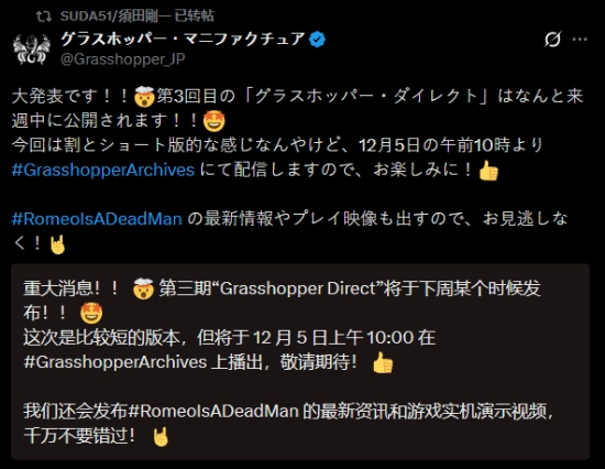近日,草蜢工作室官方账户发布消息称,他们计划于北京时间12月5日上午9点推出一期时长5分钟的“Grasshopper Direct”线上发布会,会上将揭晓《罗密欧是个绝命侠》的最新游戏动态及实机试玩演示内容。