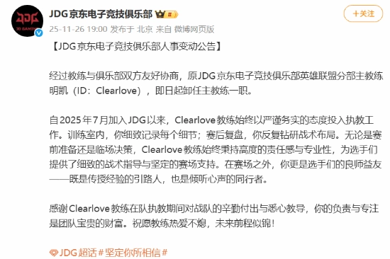 经过教练与俱乐部的友好协商,原JDG京东电子竞技俱乐部英雄联盟分部主教练明凯(ID:Clearlove),自即日起正式卸任主教练职务。