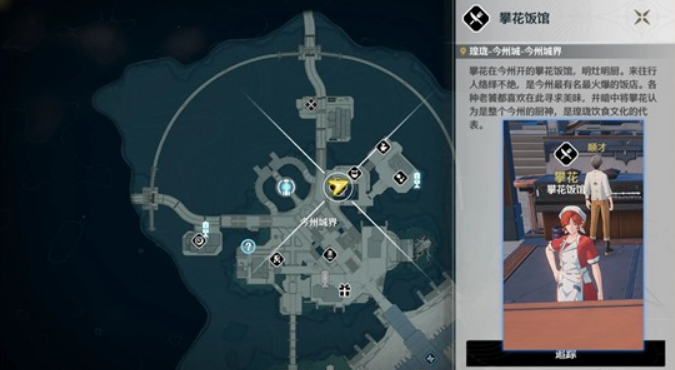 攀花饭馆位于瑝珑地区的今州城界内,由厨师攀花经营打理。当你与她互动并选择“我想看看菜单”这一选项后,就能查看可供购买的菜品和食谱。在这里可以获取的食谱有龙须酥食谱、小龙包食谱、今州烩食谱、星星酥食谱和油辣豆腐食谱。这些料理大多带有浓郁的地方特色,在鸣潮的世界观里,也展现出了今州城别具一格的饮食文化底蕴。