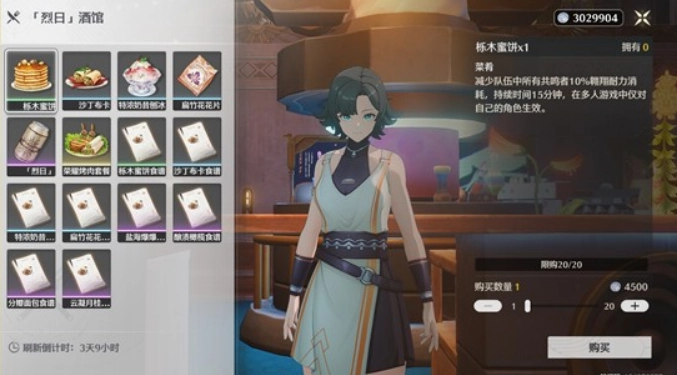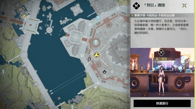 烈日酒馆坐落在黎那汐塔的卡庇托山山顶,由NPC富尔维娅负责经营。和她对话时选择“我想买点吃的”这一选项,就能直接购买各类菜肴以及对应的食谱。这里有栎木蜜饼食谱、沙丁布卡食谱、特浓奶昔刨冰食谱、扁竹花花片食谱等。另外,盐海爆爆康食谱、酿渍橄榄食谱、分瓣面包食谱和云凝月桂虾食谱也都能在这里买到,它是鸣潮里能获取较多食谱的地点之一。