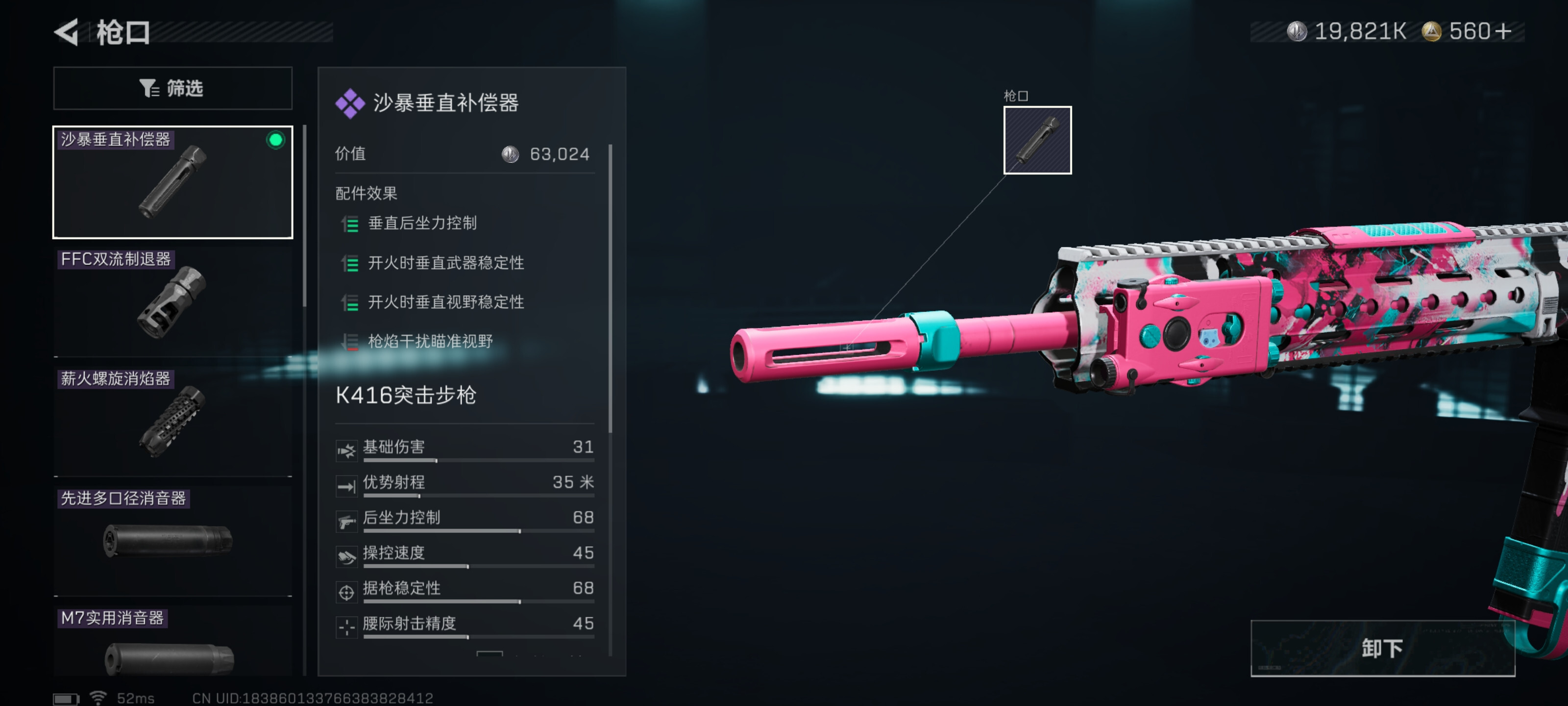枪口选用沙暴垂直补偿器,该枪口可显著增强垂直后坐力的控制效果,同时提升开火过程中武器与视野的稳定性。