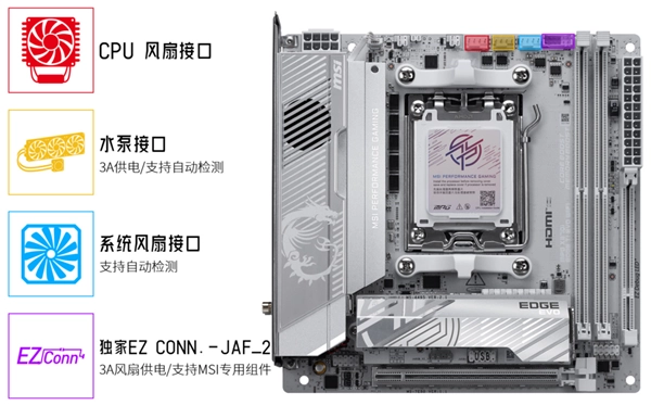 MPG X870I EDGE TI EVO WIFI传承了微星EDGE系列的金属质感设计风格,采用冷峻的银色散热装甲与白色PCB板组合,外观拥有很高的辨识度和强烈的科技感。