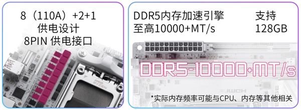 在内存配置上,这款主板的DDR5内存频率最高能支持到10000+ MT/s,搭配Memory Boost技术以及AMD OPP等模式使用,内存效率最多可以提升122%。