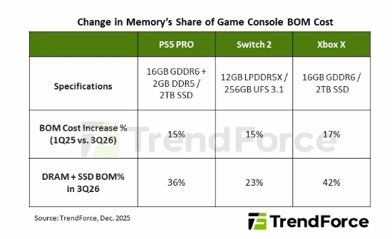 在存储厂商大规模转向快速增长的AI数据中心需求之前,TrendForce原本预测的下跌幅度仅为3.5%。相关报告提到,主机厂商往往需要自行承担硬件销售带来的亏损,而存储芯片在Switch 2的成本构成中占比约21%-23%,在PS5和Xbox平台的成本占比更是达到了约35%的较高水平。即便来自游戏及订阅服务的利润,也难以抵消这些不断上升的成本压力。